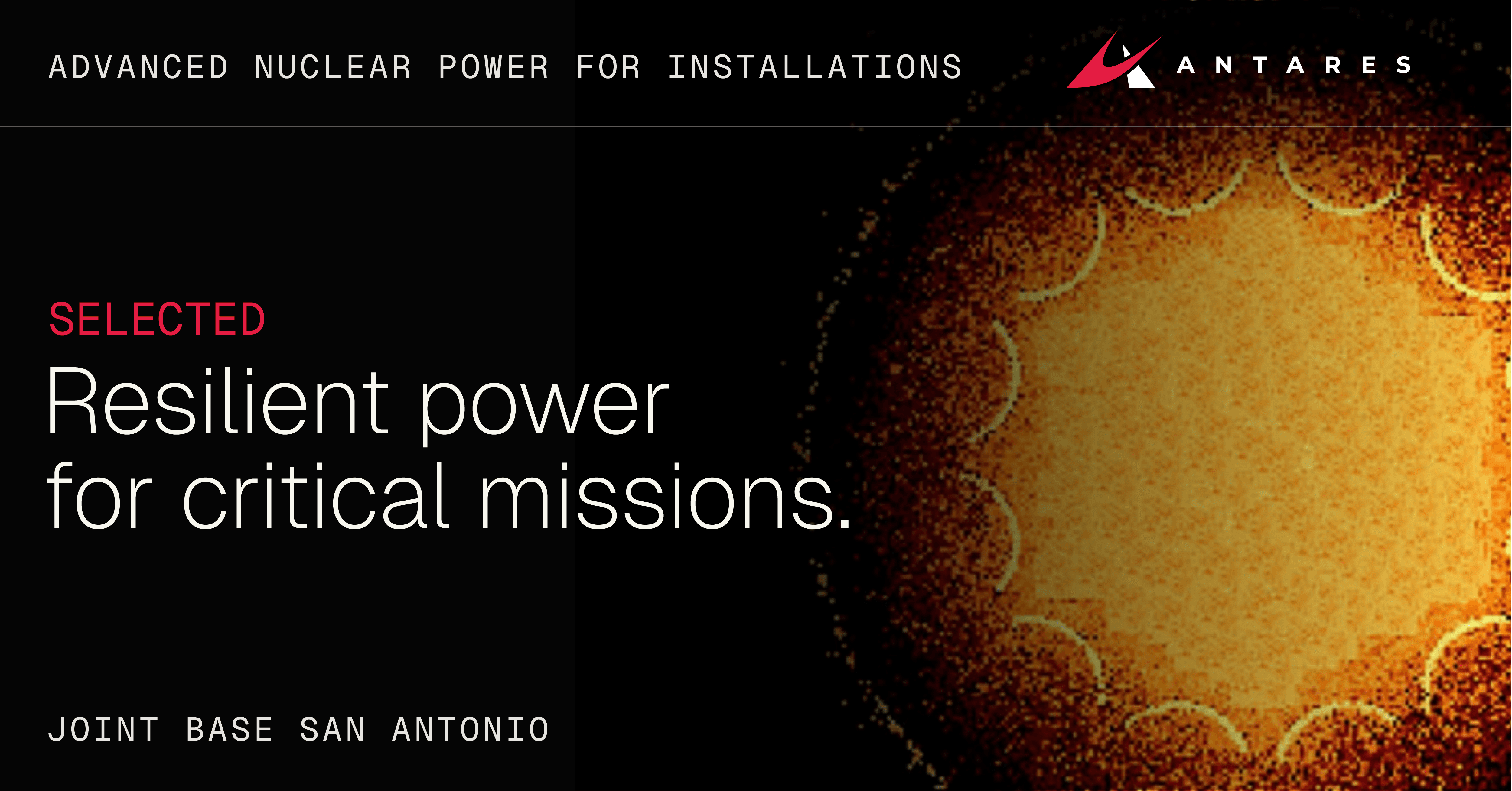 SAN ANTONIO, Texas — The Department of the Air Force, in conjunction with the Defense Innovation Unit, has selected Antares for the proposed deployment of a prototype nuclear microreactor at Joint Base San Antonio under the Advanced Nuclear Power for Installations (ANPI) initiative.