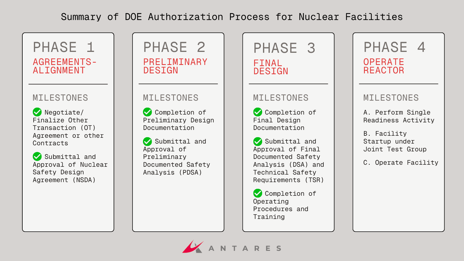 The advanced nuclear energy company Antares received U.S. Department of Energy (DOE) approval of the Documented Safety Analysis for its Mark-0 reactor under DOE standard 1271.
